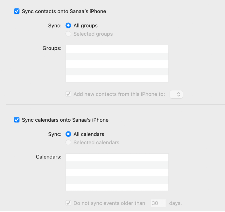 Sincronize contatos e calendários entre o Mac e um iPhone, iPad ou